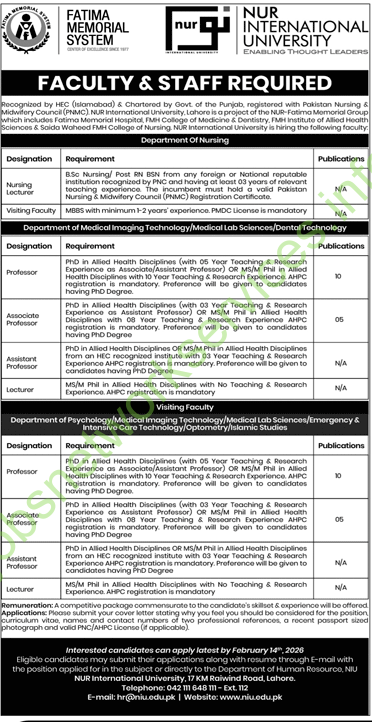 Nur International University Jobs 2026 for Faculty & Staff Required