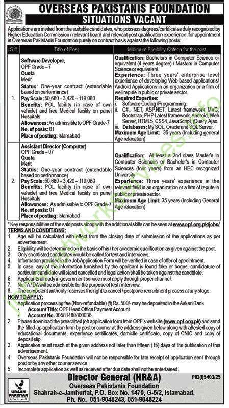 Job Overseas Pakistanis Foundation (OPF) Job Advertisement for the positions of Software Developer and Assistant Director (Computer), both in OPF Grade–7: