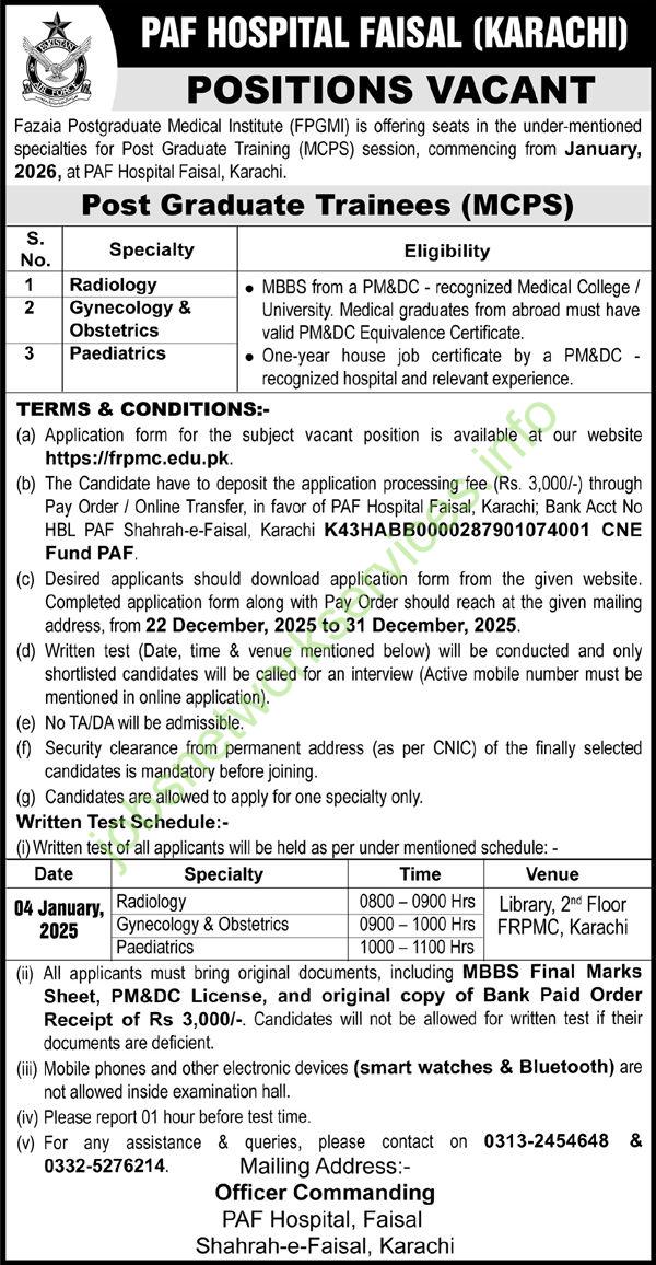 Here is a summarized and structured overview of the job posting from PAF Hospital Faisal, Karachi: