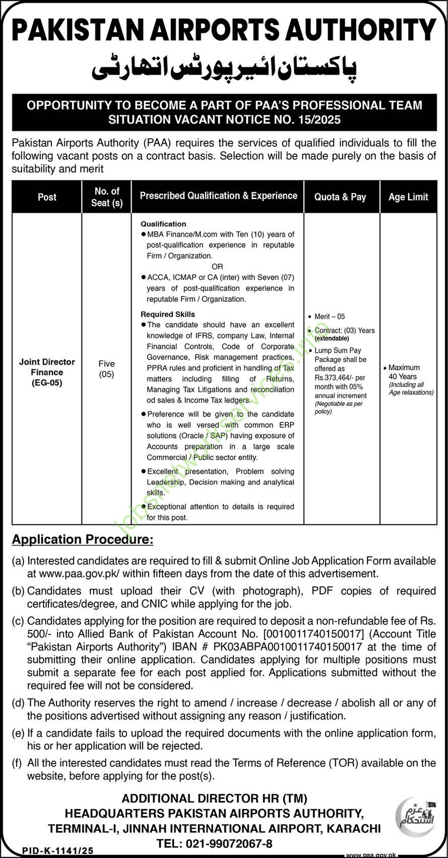 The Pakistan Airports Authority (PAA) has announced five vacant positions for Joint Director Finance (EG-05) on a contract basis. The application process is entirely online and must be completed within 15 days of the advertisement’s publication date.