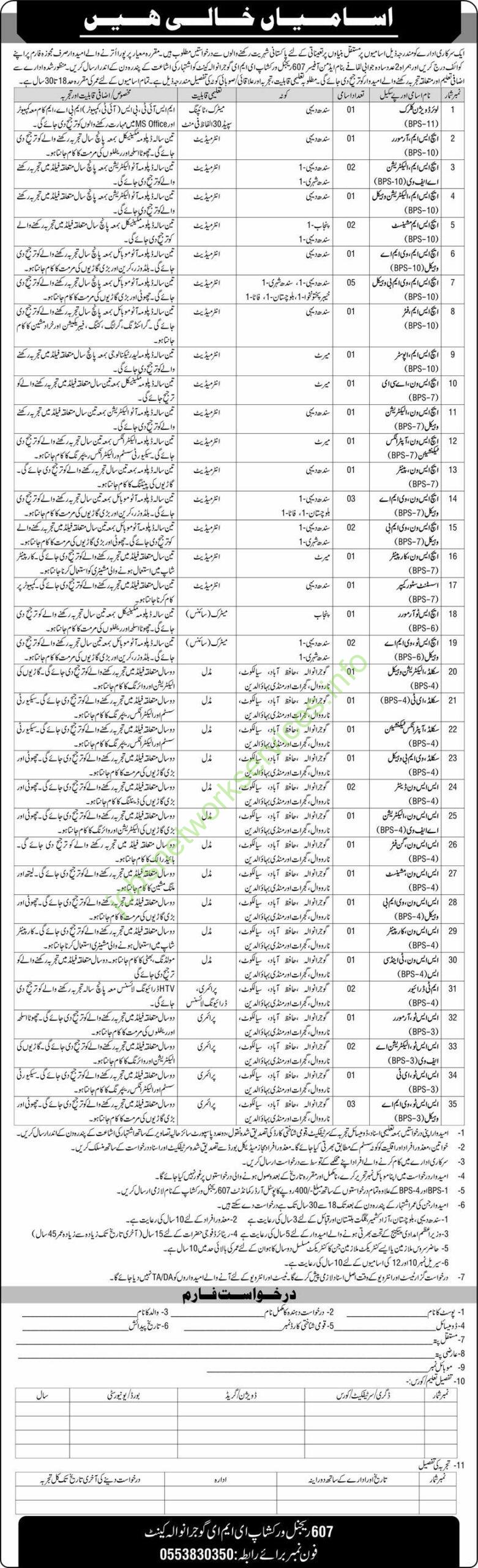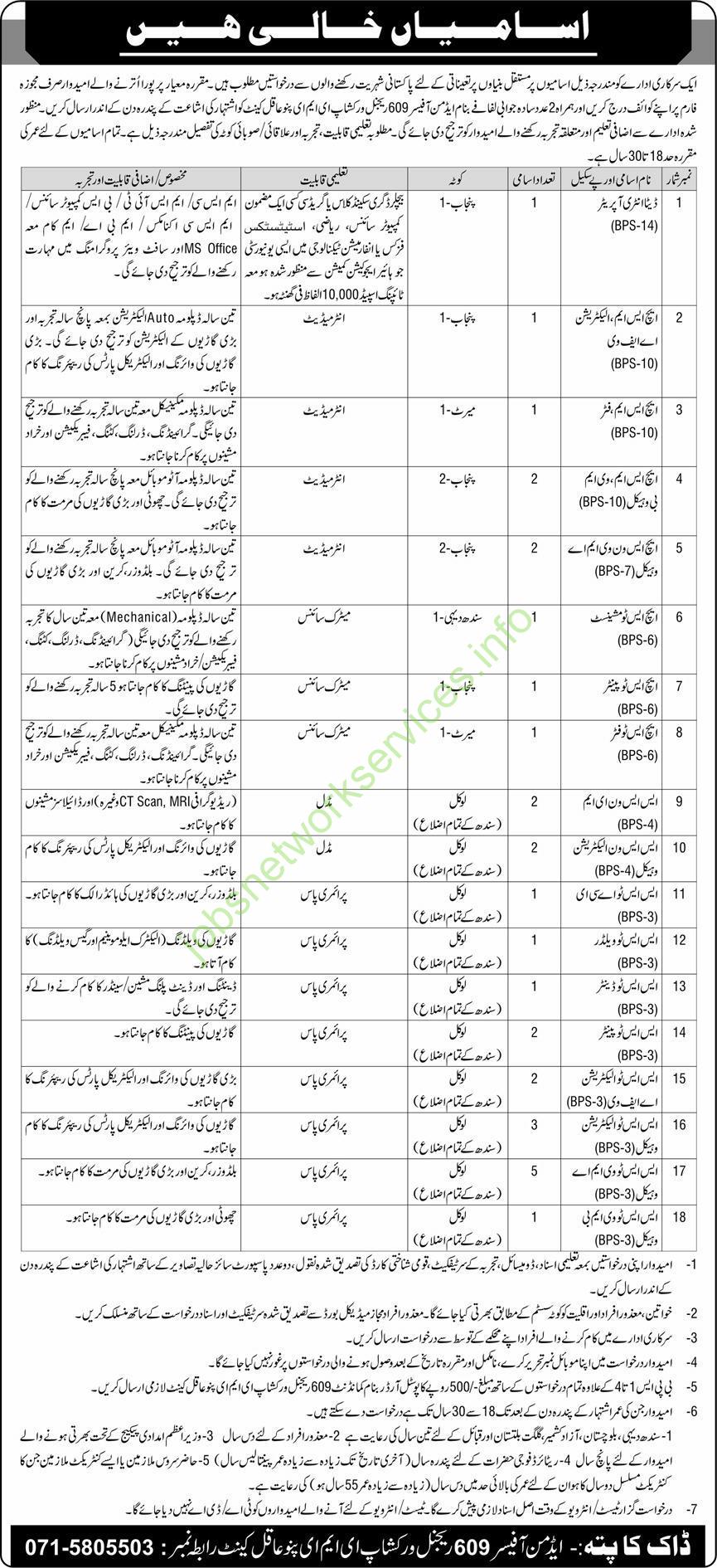 Applications are invited from Pakistani citizens for permanent appointment to the following posts in a government organization. Candidates who meet the required criteria should only fill in their details on the prescribed form and send them along with a plain self-addressed envelope to the Admin Officer 609 EME Workshop Pano Aqil Cantt within fifteen days of the publication of the advertisement. Candidates with additional education and relevant experience from a recognized institution will be preferred. The required educational qualification, experience and regional/provincial quota details are as follows. The prescribed age limit for all posts is 18-30 years.