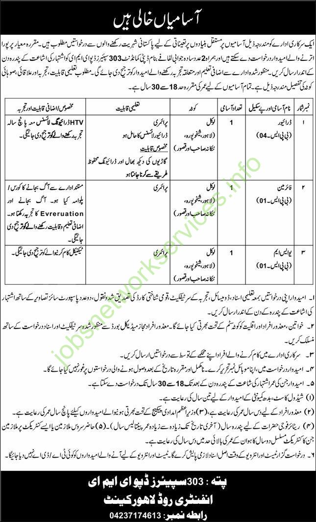 Applications are required from Pakistani citizens for permanent appointments to the following posts in a government institution. Applicants who meet the specified criteria can apply and send their applications along with two plain return envelopes addressed to the Deputy Commandant 303 Spares Depot EME within 15 days of the publication of this advertisement. Preference will be given to candidates with additional education and relevant experience from an approved institution. Details of required educational qualifications, experience, and regional/provincial quotas are as follows. The age limit for all posts is 18 to 30 years.