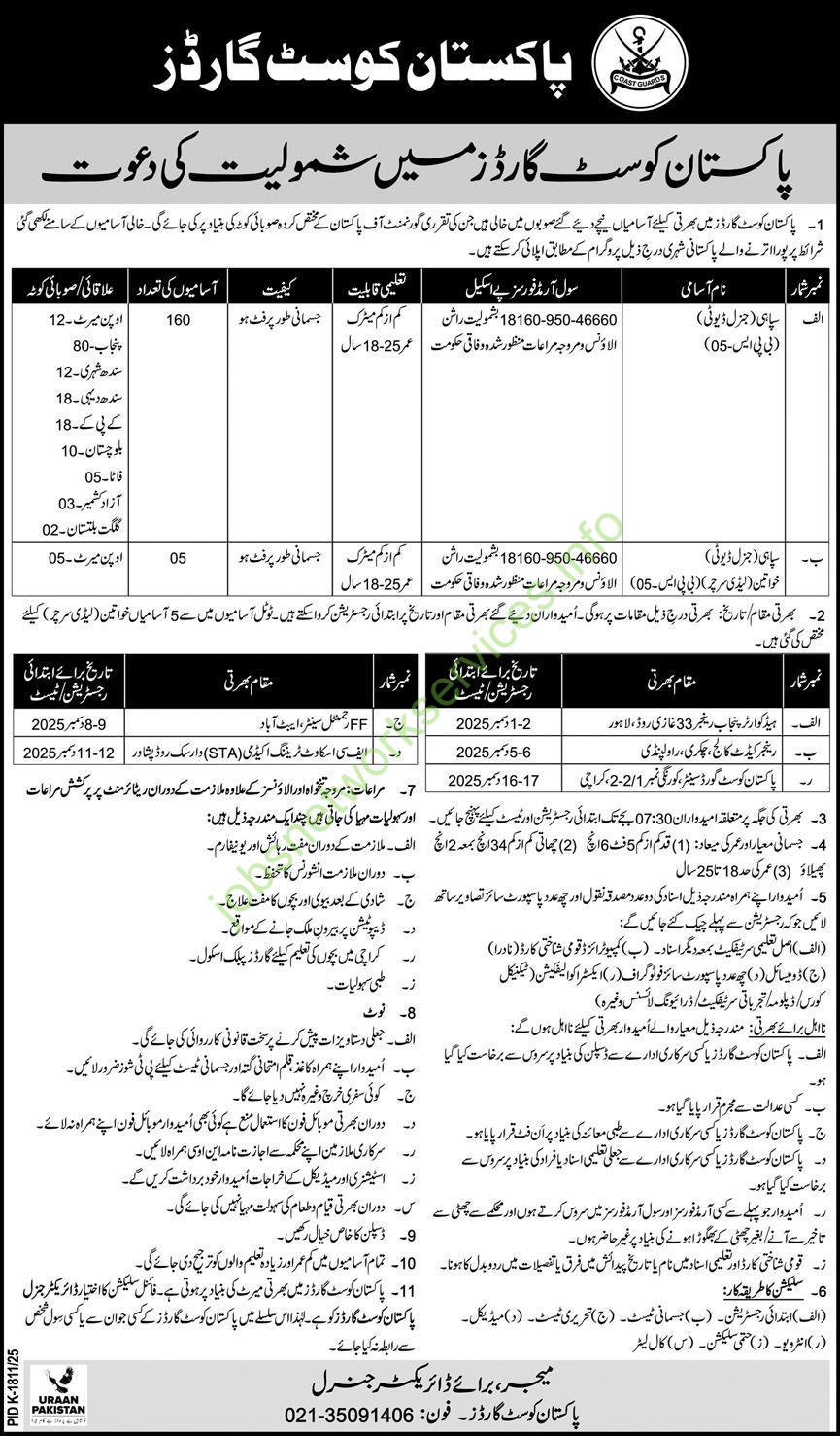 ن۔ بھرتی سے متعلق مزید معلومات کیلئے پاکستان کوسٹ گارڈز کی آفیشل ویب سائٹ وزٹ کریں۔