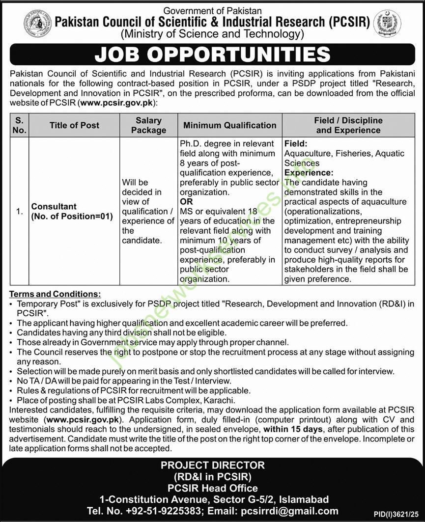 PCSIR Job Advertisement Summary: Consultant (Aquaculture)