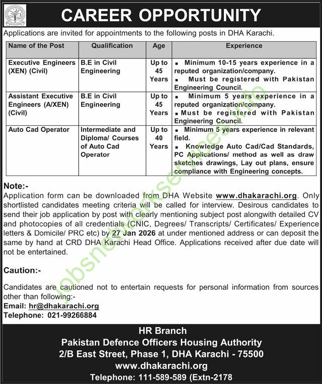 Application form can be downloaded from DHA Website www.dhakarachi.org. Only shortlisted candidates meeting criteria will be called for interview. Desirous candidates to send their job application by post with clearly mentioning subject post alongwith detailed CV and photocopies of all credentials (CNIC, Degrees/ Transcripts/ Certificates/ Experience letters & Domicile/ PRC etc) by 27 Jan 2026 at under mentioned address or can deposit the same by hand at CRD DHA Karachi Head Office. Applications received after due date will not be entertained.