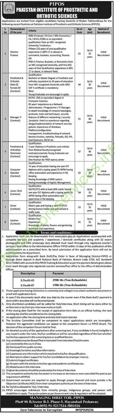 Pakistan Institute of Prosthetic and Orthotic Sciences PIPOS Jobs 2026 Latest