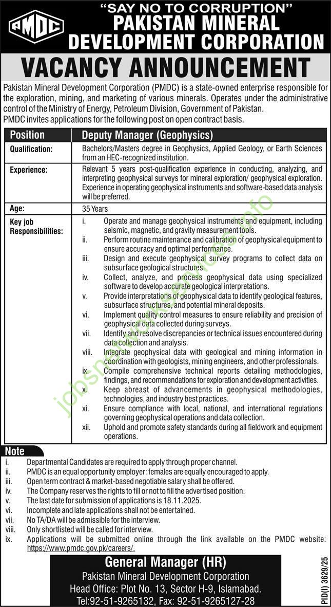 Pakistan Mineral Development Corporation (PMDC) is hiring for a Deputy Manager (Geophysics) position. This is a contract-based role for qualified professionals in geophysics and earth sciences.