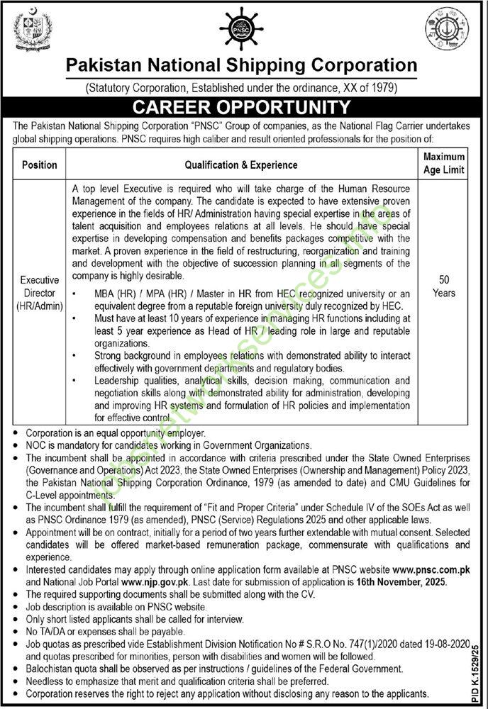 Pakistan National Shipping Corporation (PNSC), the national flag carrier, is seeking a highly experienced HR professional for a senior leadership role.