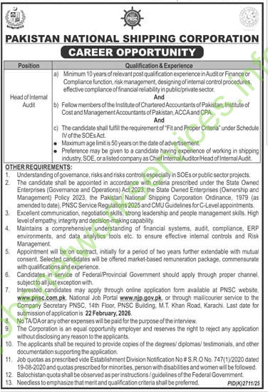 7. Interested candidates may apply through online application form available at PNSC website, pnsc.com.pk National Job Portal www.njp.gov.pk  or through mail/courier service to the Company Secretary PNSC, 14th Floor, PNSC Building, M.T. Khan Road, Karachi. Last date for submission of application is 22 February, 2026.