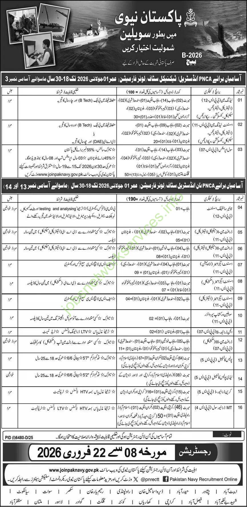 This advertisement details the recruitment of civilian staff for the Pakistan Navy (Batch 2026-B). Registration is open from February 8 to February 22, 2026.
