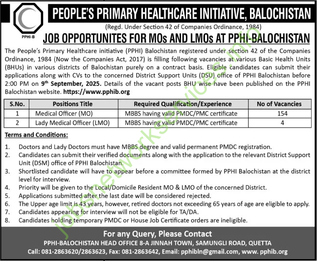 People’s Primary Healthcare Initiative Balochistan Jobs 2025 Apply Online Jobs Online Apply Latest Career Opportunities Latest Apply Online Latest Pakistan Jobs – Pakistan Today Jobs 2025 has been announced through the advertisement and applications from the Balochistan PPHI Jobs 2025 Today Jobs 2025 the eligible Male/Female candidates from across the country can apply through the procedure defined by the organization and can get these Today Jobs in Pakistan 2025 after the complete recruitment Process۔