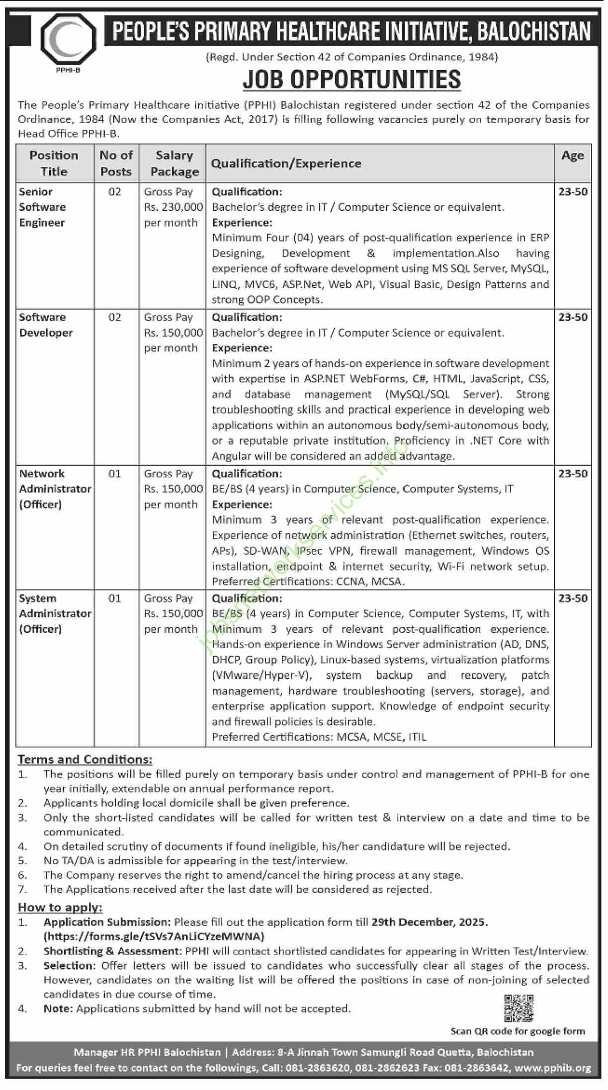 | Network Administrator | 01 | Rs. 150,000 | BE/BS (4 years) in CS/IT; 3+ years networking, CCNA/MCSA preferred | 23–50 |