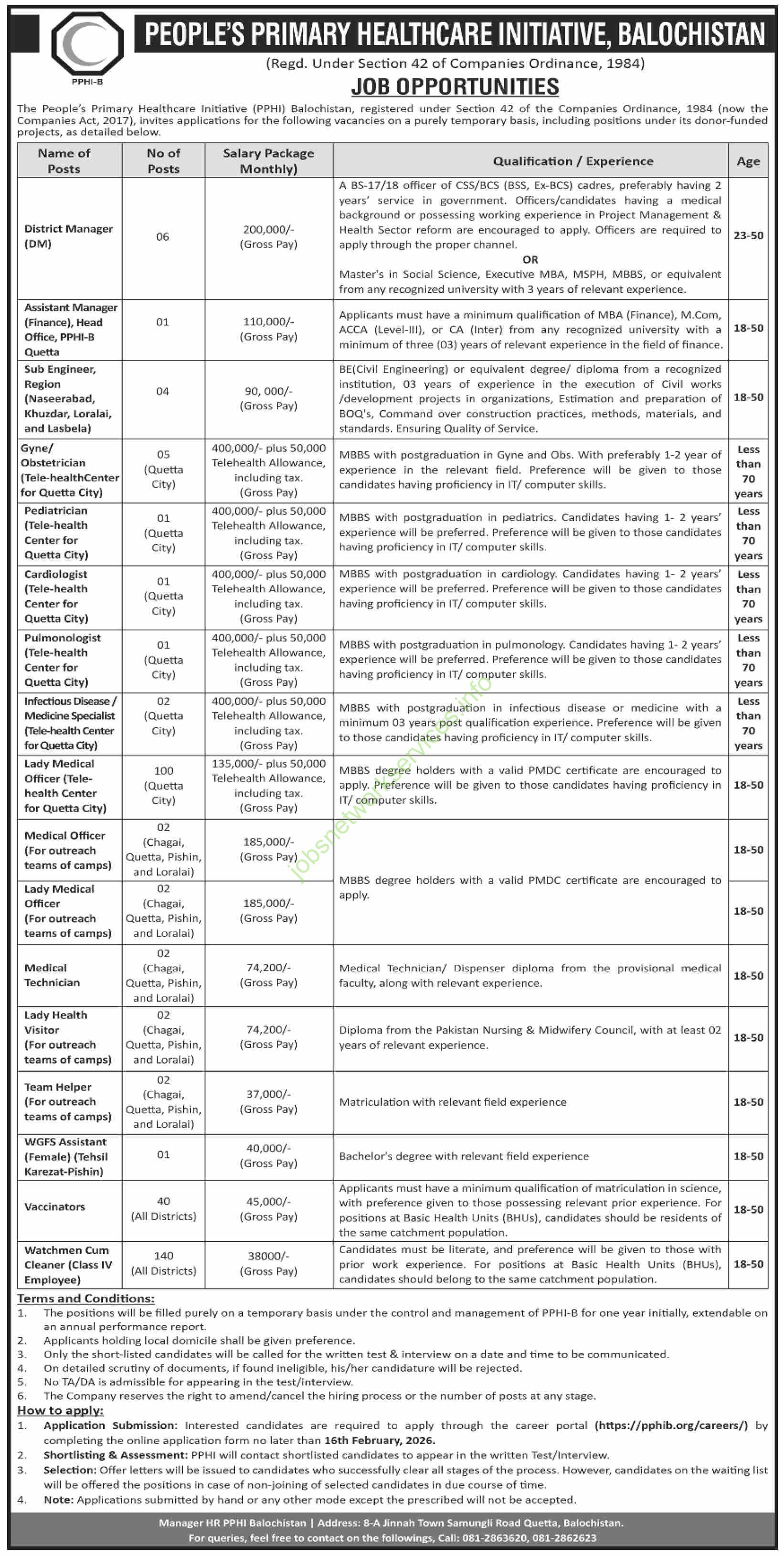 This advertisement details various job opportunities at the People’s Primary Healthcare Initiative (PPHI), Balochistan for February 2026. All positions are on a temporary basis for an initial period of one year.