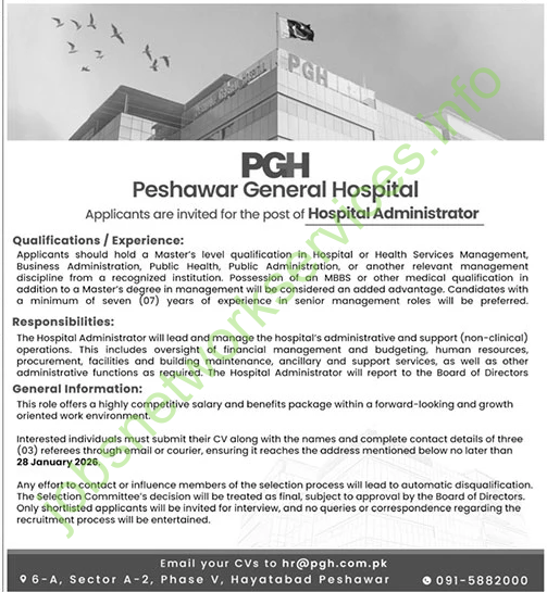 Candidates must possess a Master’s degree in Hospital or Health Services Management, Business Administration, Public Health, Public Administration, or a related management discipline from a recognized institution. An additional MBBS or medical qualification, along with a Master’s in management, will be considered an advantage. Preference will be given to candidates with at least seven (07) years of experience in senior management roles.
