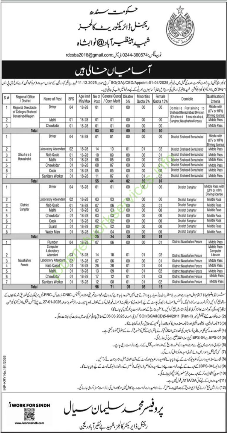 | 1 | Regional Directorate of Colleges Shaheed Benazirabad Region | Driver | 04 | 18-28 | 01 | 01 | 00 | 00 | 00 | Middle Pass with LTV or HTV Driving license | Domicile Pertaining to Shaheed Benazirabad Division (Shaheed Benazirabad, Sanghar, Naushahro Feroze) |