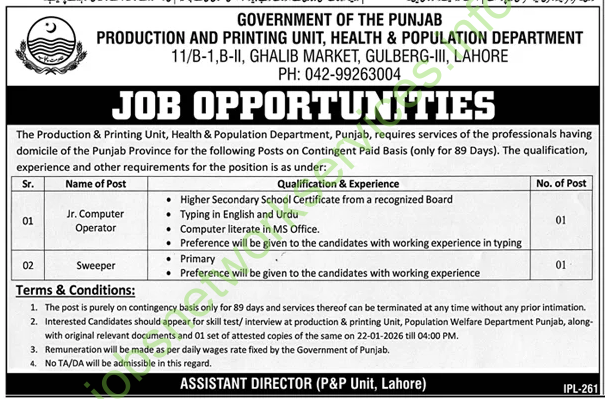 - Candidates must appear for skill test/interview on 22-01-2026 by 4:00 PM at the Production & Printing Unit, Population Welfare Department Punjab, with original documents and one set of attested copies.
