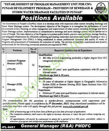 The main objective of the Program is to improve public health, reduce water pollution, manage flooding, and safeguard infrastructure by efficiently collecting and treating wastewater and stormwater runoff. To ensure professional execution and quality of work, a Program Management Unit (PMU) is being established. The Government is seeking qualified, experienced, and dynamic professionals for the following positions: