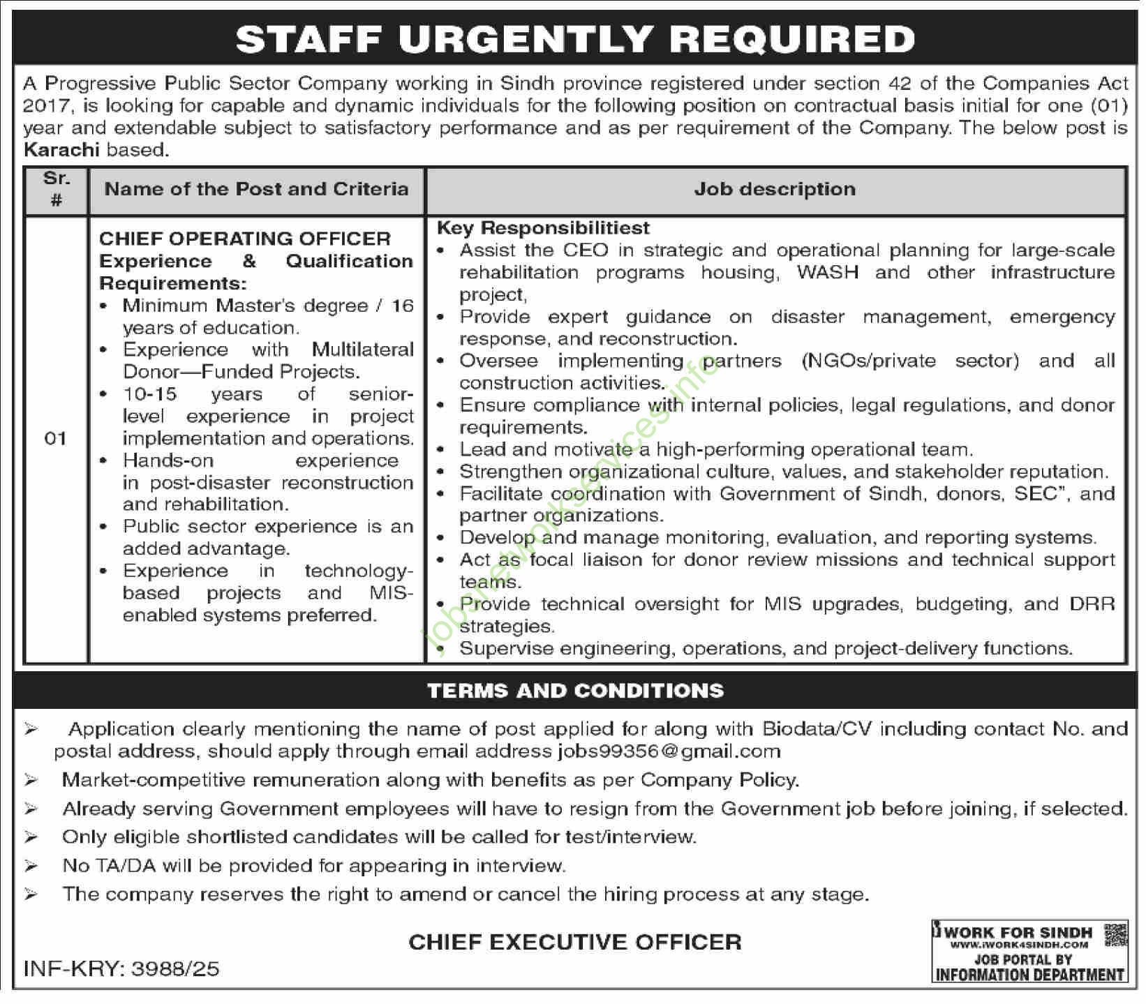 A progressive public sector company in Sindh is urgently hiring for a senior, Karachi-based position on a one-year contract.