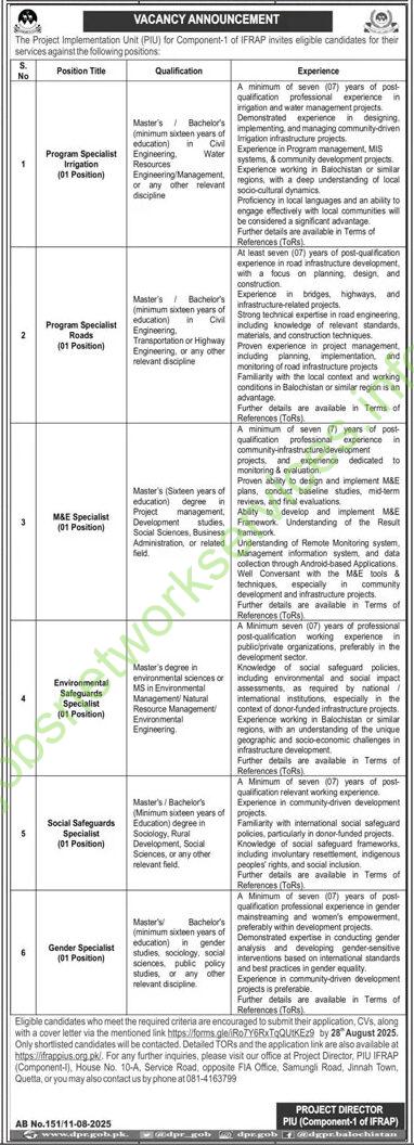 | 2 | Program Specialist (Roads) | Master’s/Bachelor’s in Civil/Transportation/Highway Engineering or related. | 7+ years in road infrastructure (bridges/highways), project management. Familiarity with Balochistan’s terrain is a plus. |