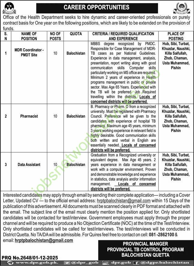 Provincial TB Control Program Balochistan New Jobs December 2025 Latest