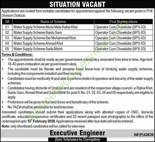 Applications are invited from suitable candidates for appointment against the following vacant posts in PHE Division Orakzai.