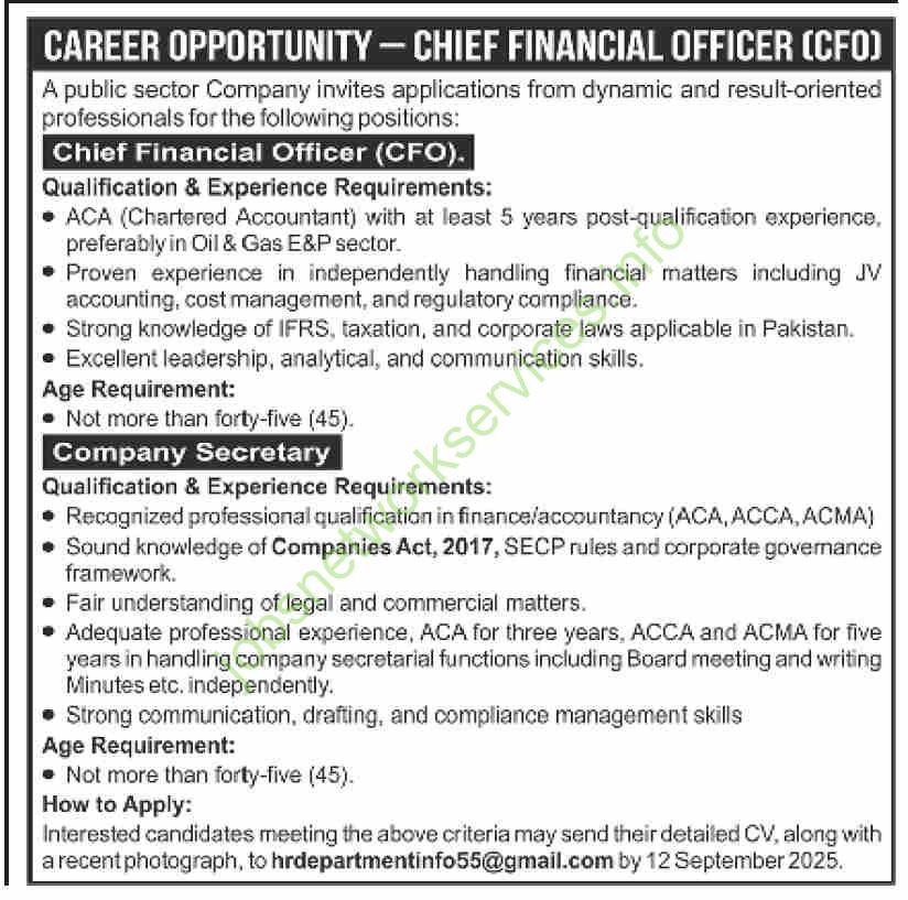 A public sector company in Pakistan is hiring for two senior-level positions. The application deadline is September 12, 2025.