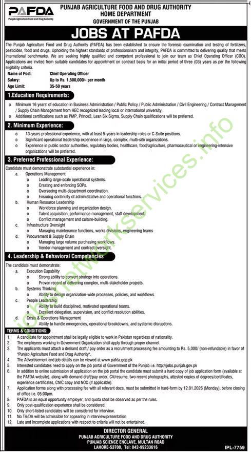 Here are the key details extracted from the job advertisement for the Chief Operating Officer (COO) position at the Punjab Agriculture Food and Drug Authority (PAFDA):