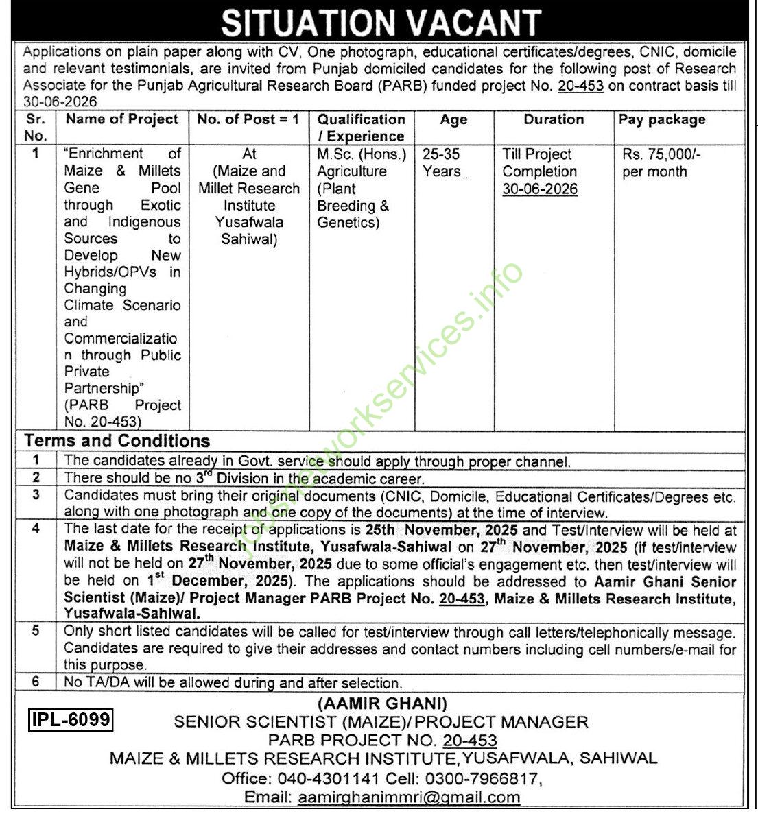 The Maize & Millets Research Institute, Yusafwala-Sahiwal, is hiring a Research Associate for a specific PARB-funded project on a contract basis.