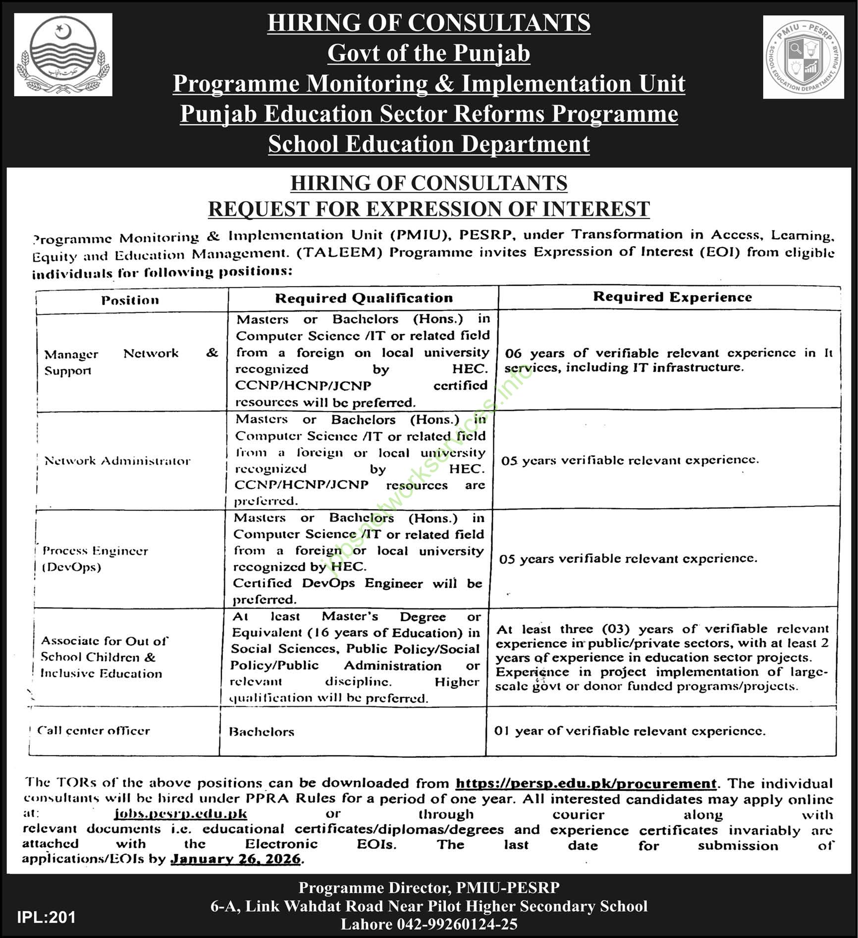 • Issuing Authority: Programme Monitoring & Implementation Unit (PMIU), PESRP