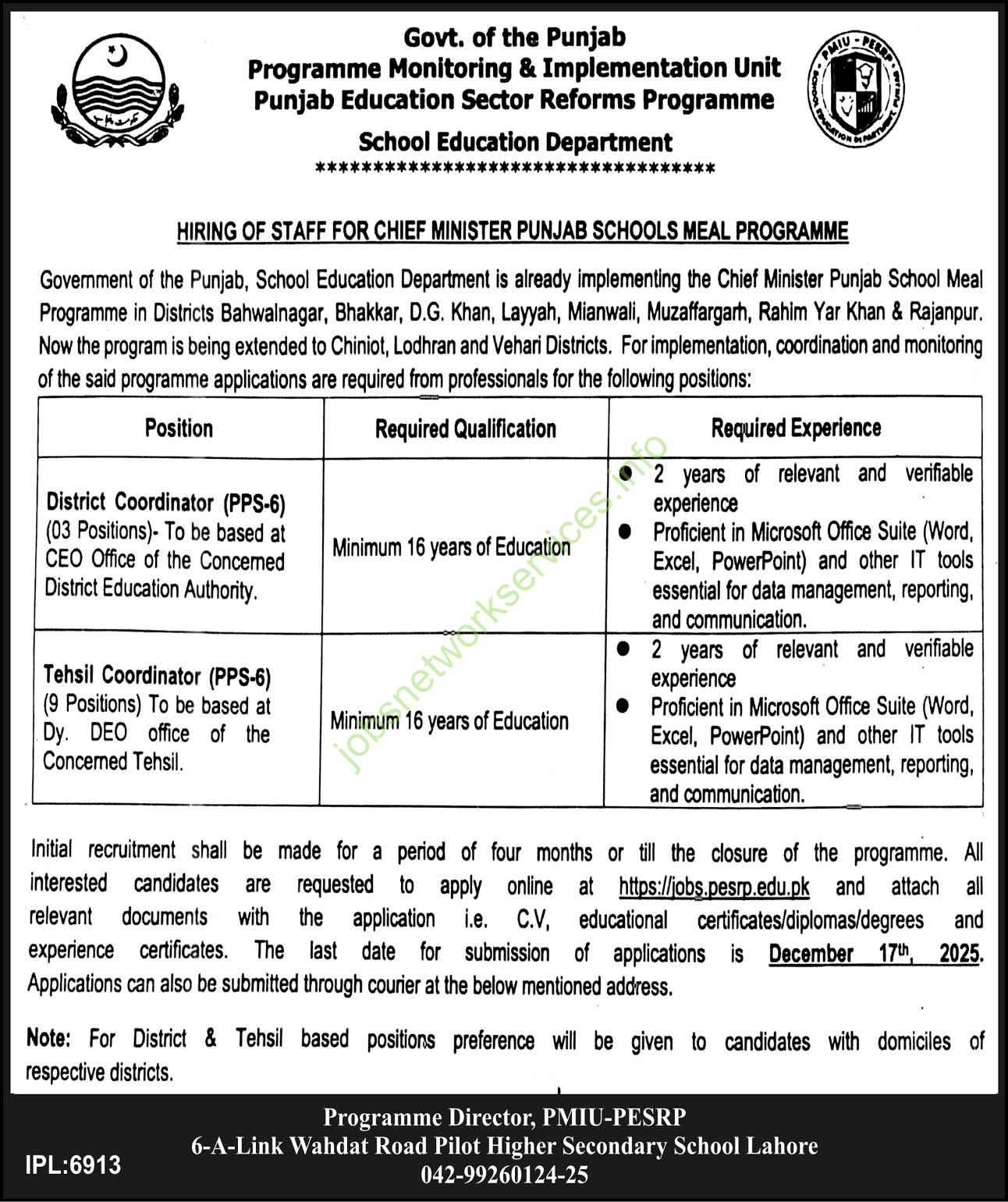 This document is a job advertisement from the Punjab Education Sector Reforms Programme (PESRP) for the Chief Minister Punjab Schools Meal Programme.