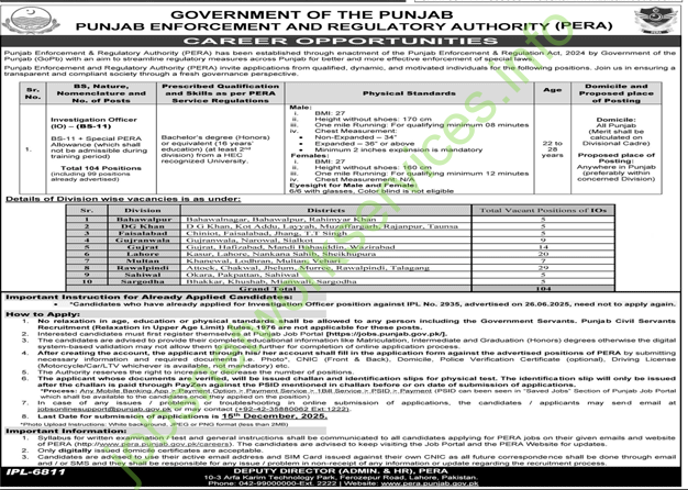 Punjab Enforcement and Regulatory Authority PERA Jobs December 2025 Latest
