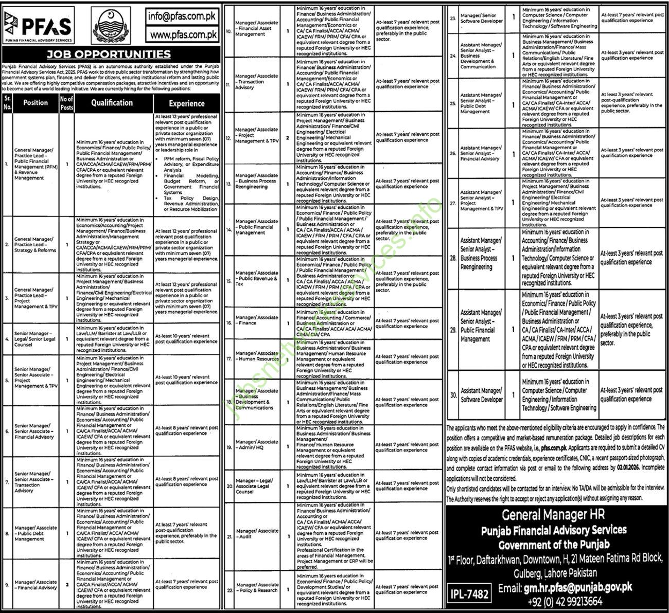 Public Financial Management & Advisory Services (PFAS) is an autonomous body established under the Punjab Financial Management & Advisory Services Act, 2023. PFAS assists the government in designing, developing, and implementing sound PFM systems to plan, finance, and deliver for citizens, businesses, and public sector partners. We offer highly competitive compensation packages, attractive incentives and an opportunity to work in a challenging environment. We invite applications from highly motivated professionals for the following positions: