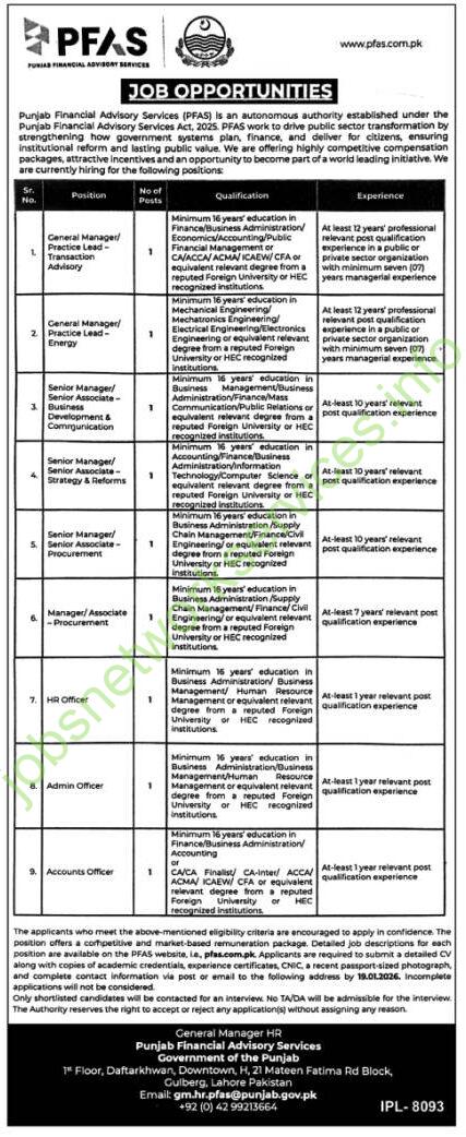 This is a detailed job advertisement from the Punjab Financial Advisory Services (PFAS), Government of Punjab, Pakistan. Here’s a summary and key takeaways: