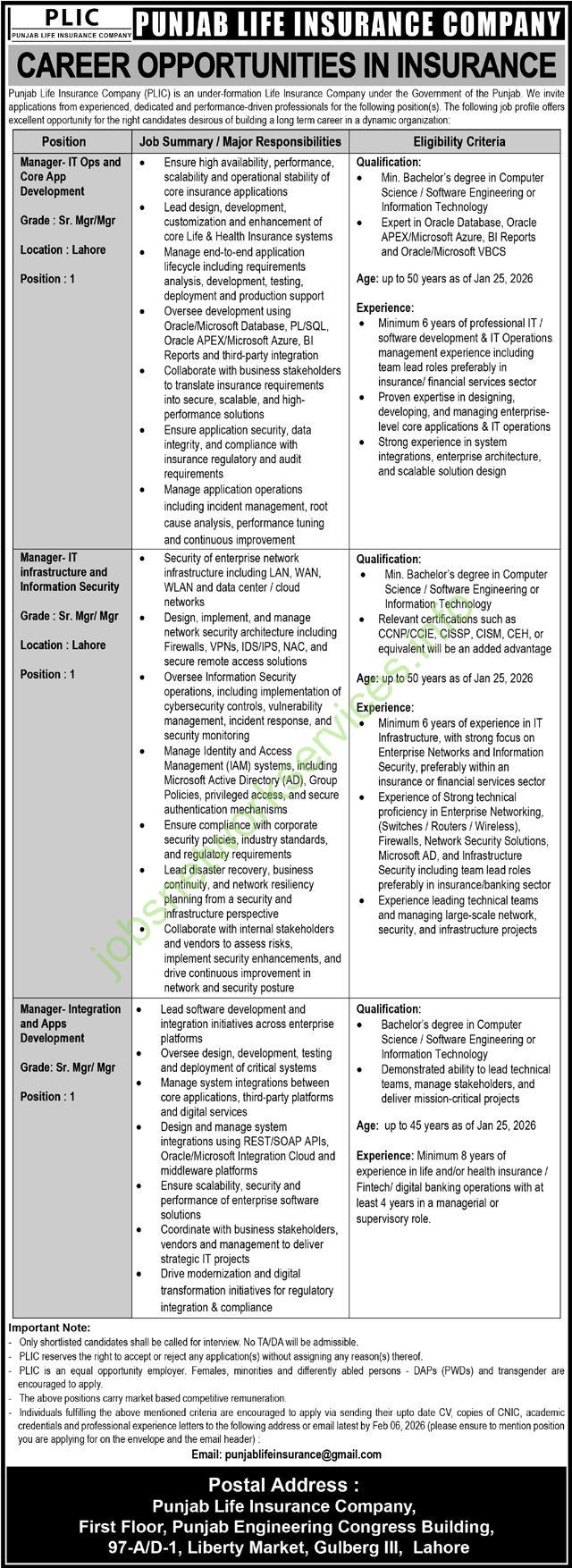 Based on the image content, here is a structured summary of the job openings at Punjab Life Insurance Company (PLIC) for 2026: