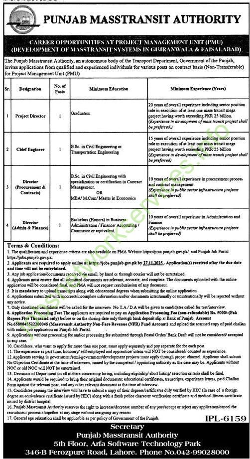 The Punjab Masstransit Authority (PMA) is hiring for four senior-level, contract-based positions to staff its Project Management Unit (PMU). The unit is responsible for developing mass transit systems in the cities of Gujranwala and Faisalabad.