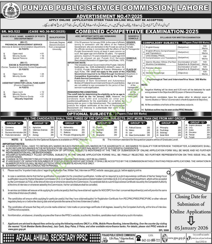 | Key Instructions | • No change in optional subjects after submission. • Provide original documents (degrees, NOC, certificates) at the interview. • CGPA is not accepted; provide marks/percentage certificates. • Trust only information on the official PPSC website. • Admission letters will be uploaded on the website; candidates notified via SMS/Email. |