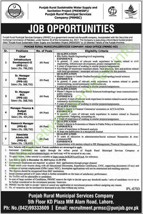 Job opportunities from the Punjab Rural Municipal Services Company (PRMSC) for 2025.
