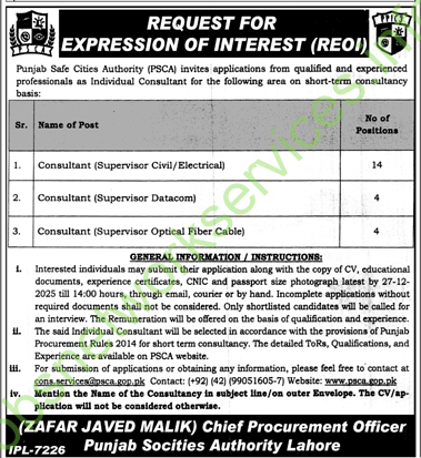 Punjab Safe Cities Authority (PSCA) invites applications from qualified and experienced professionals as Individual Consultant for the following area on short-term consultancy basis: