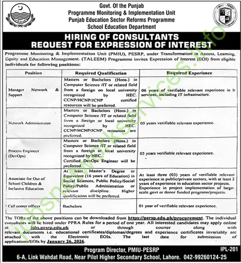 The Programme Monitoring & Implementation Unit (PMIU), PESRP, under the Transformation in Access, Learning, Equity and Education Management (TALEEM) Programme, invites Expression of Interest (EOI) from eligible individuals for the following positions: