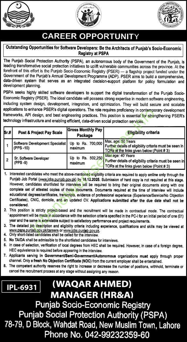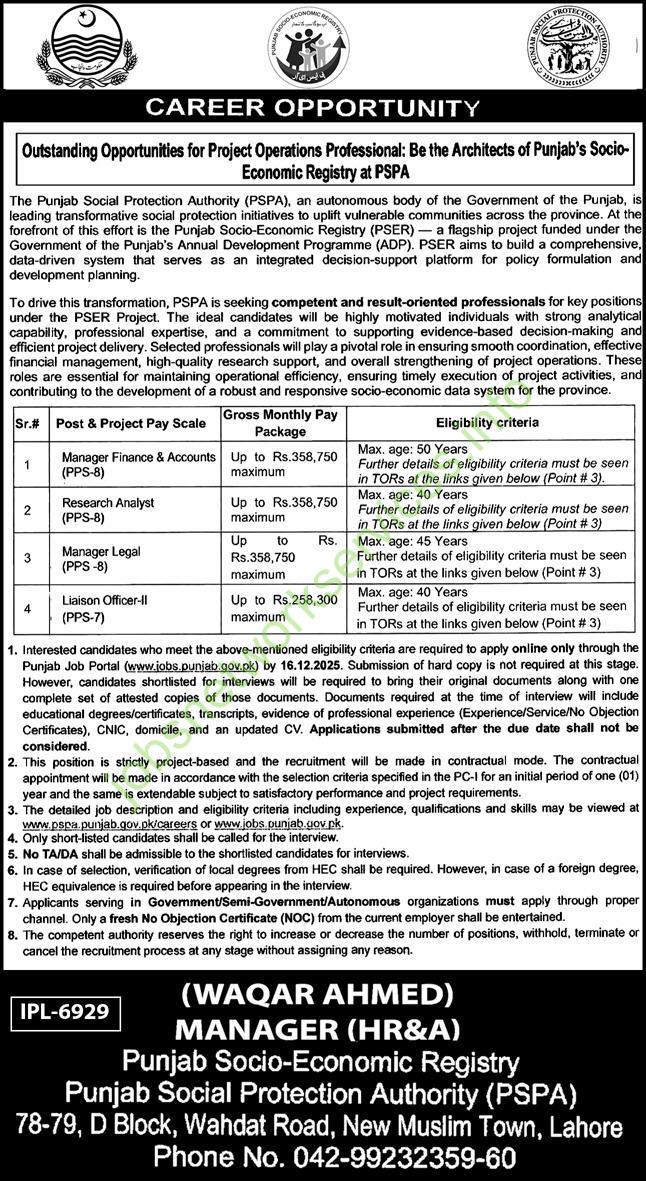 The Punjab Social Protection Authority (PSPA) has announced two separate but related job advertisements for its flagship project, the Punjab Socio-Economic Registry (PSER). The application deadline for both is December 16, 2025.