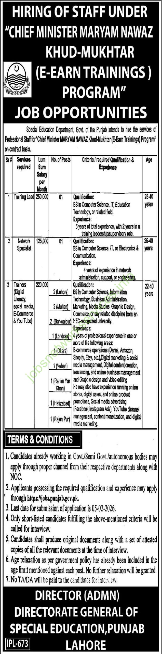 Special Education Department, Govt. of the Punjab intends to hire the services of Professional Staff for “Chief Minister MARYAM NAWAZ Khud-Mukhtar (E-Earn Trainings) Program” on contract basis.
