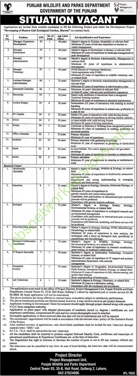 Here is a clear, organized summary of the job advertisement from the Punjab Wildlife and Parks Department for 2026.