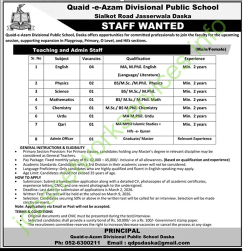 Summary: Quaid-e-Azam Divisional Public School Jobs 2026