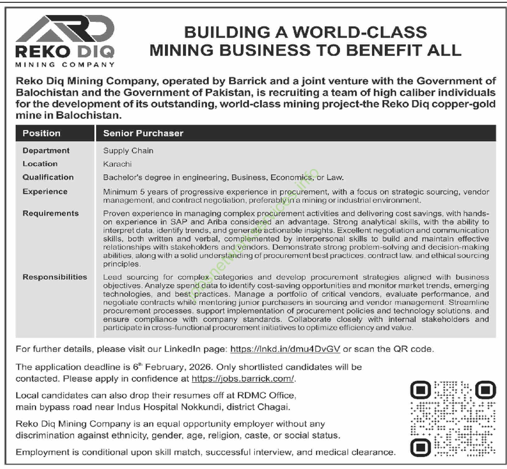 Reko Diq Mining Company, operated by Barrick and a joint venture with the Government of Balochistan and the Government of Pakistan, is recruiting a team of high caliber individuals for the development of its outstanding, world-class mining project—the Reko Diq copper-gold mine in Balochistan.