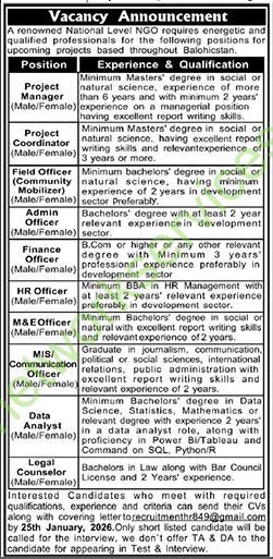 A renowned National Level NGO requires energetic and qualified professionals for the following positions for upcoming projects based throughout Balochistan.