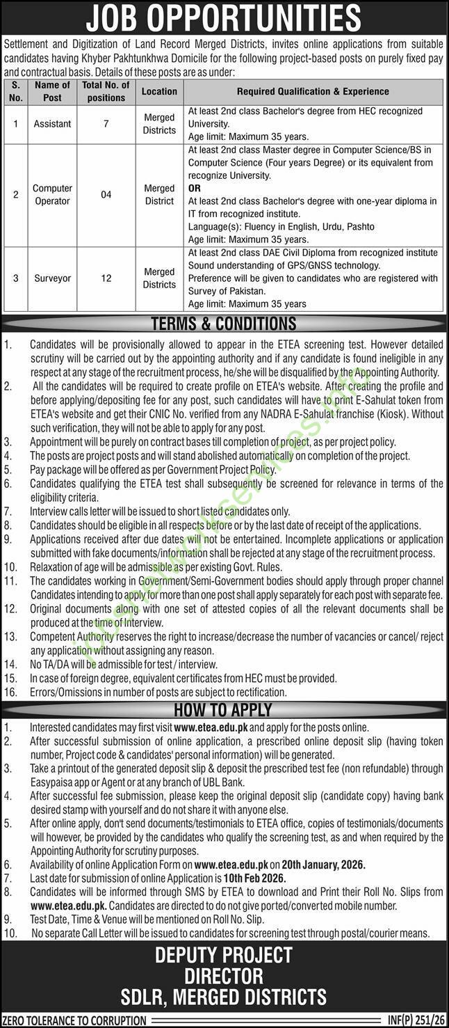 Settlement and Digitization of Land Record Merged Districts, invites online applications from suitable candidates having Khyber Pakhtunkhwa Domicile for the following project-based posts on purely fixed pay and contractual basis. Details of these posts are as under: