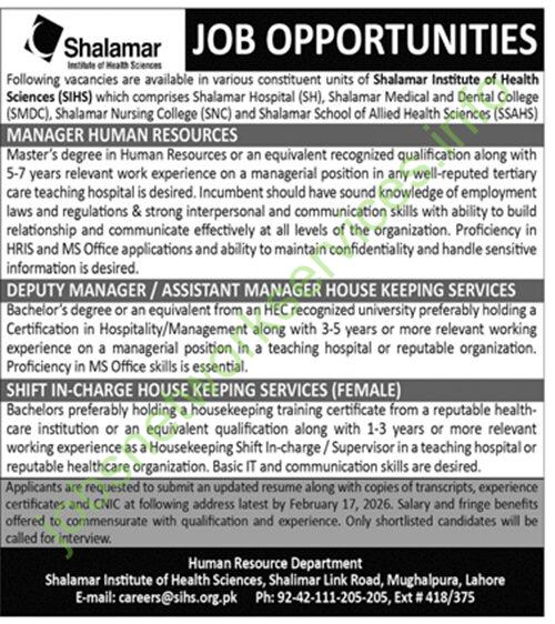 Following vacancies are available in various constituent units of Shalamar Institute of Health Sciences (SIHS) which comprises Shalamar Hospital (SH), Shalamar Medical and Dental College (SMDC), Shalamar Nursing College (SNC) and Shalamar School of Allied Health Sciences (SSAHS).