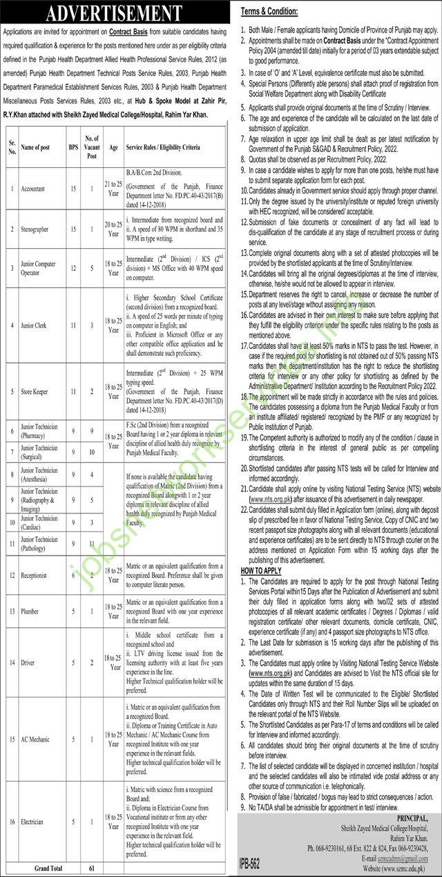 Jobs advertisement for job vacancies at Sheikh Zayed Medical College Hospital, Rahim Yar Khan. Here’s a clear breakdown of the key details:
