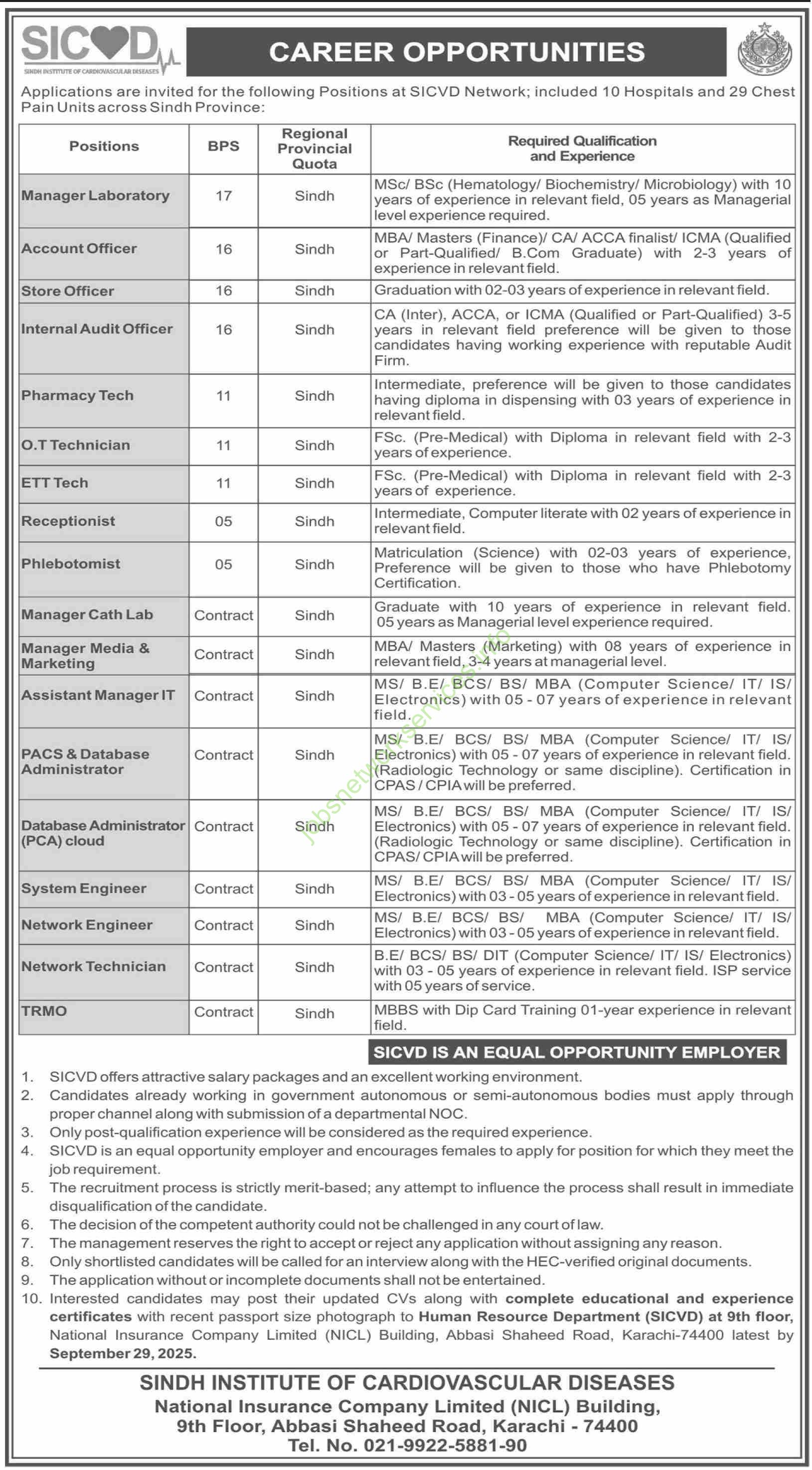 Sindh Institute of Cardiovascular Diseases SICVD Jobs 2025