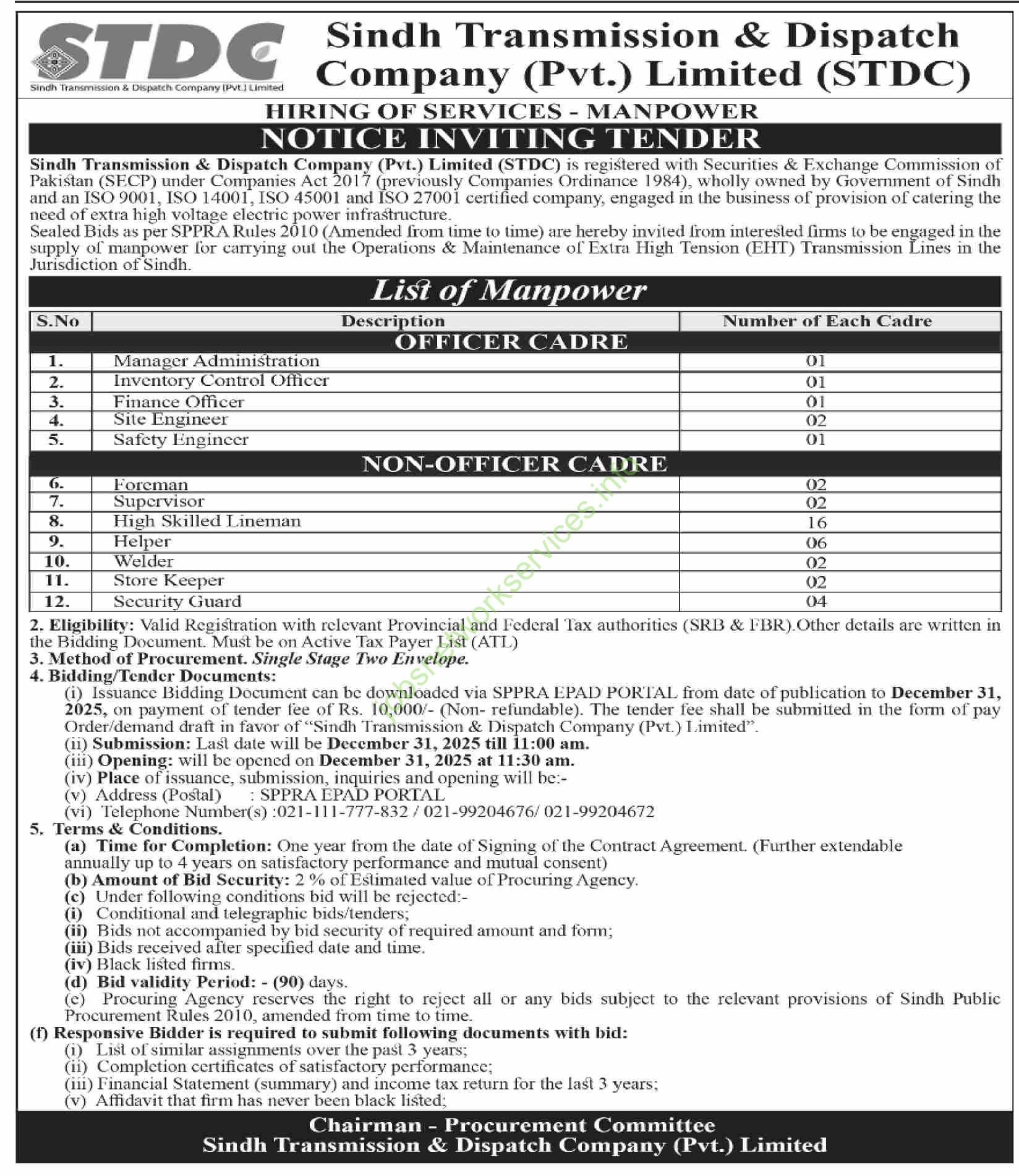 Sindh Transmission & Dispatch Company (STDC) Tender Notice for hiring manpower services: